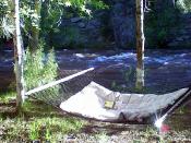 I sprawl into the swaying paradise and begin to sing praises in competition with raucous waves . The Thompson is raging with waters higher than I have observed in 20 years. As the river races furiously downstream, mud and silt paint the surface a copper hue crowned with white foam. Swirling, crashing into boulders at a frantic pace, water bounces into the air and explodes like liquid fireworks. The sight brought laughter and feeble attempts to photograph the elusive spray.
